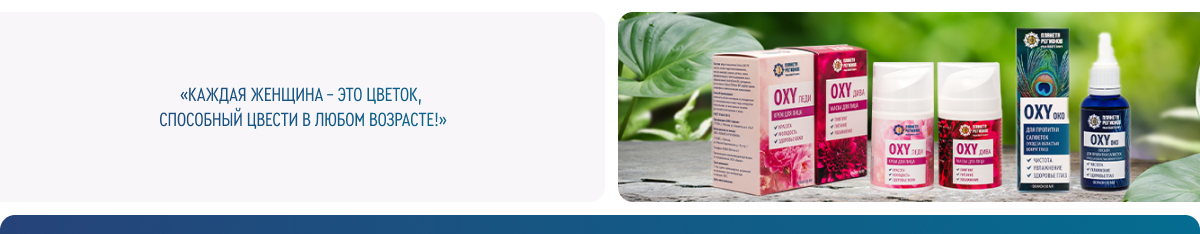 Для того, чтобы как можно больше женщин правильно ухаживали за собой, были красивыми и счастливыми в любом возрасте, Компания «ПЛАНЕТА РЕГИОНОВ» представляет крем для лица «OXYледи» и лосьон для ухода за областью вокруг глаз «OXYоко». Активным действующим веществом в косметических средствах является OXYхлорофиллКОСМЕТИЧЕСКИЕ СРЕДСТВА ЛИНИИ «OXYхлорофилл» – ЭТО КРАСОТА, СИЯНИЕ, ВДОХНОВЕНИЕ, ДВОЙНОЕ ВОСХИЩЕНИЕ ОКРУЖАЮЩИХ И ТАЙНА ВАШЕГО ПРЕВОСХОДСТВА! ПРИМЕНЯЯ СРЕДСТВА ПО УХОДУ ЗА КОЖЕЙ ОТ КОМПАНИИ «ПЛАНЕТА РЕГИОНОВ», ВЫ ВЫБИРАЕТЕ ЛУЧШЕЕ ИЗ ВОЗМОЖНОГО!