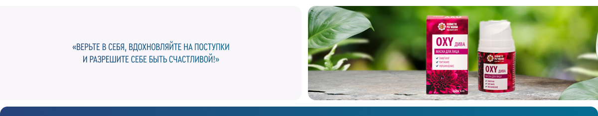 АКТИВНЫЕ КОМПОНЕНТЫ, СОДЕРЖАЩИЕСЯ В МАСКЕ «OXYДИВА», СТИМУЛИРУЮТ ОБМЕННЫЕ ПРОЦЕССЫ В КЛЕТКАХ ДЕРМЫ, ЧТО УСИЛИВАЕТ РЕГЕНЕРАЦИЮ ТКАНЕЙ КОЖИ. ПРИ РЕГУЛЯРНОМ ПРИМЕНЕНИИ ДОСТИГАЕТСЯ ВИДИМЫЙ ОМОЛАЖИВАЮЩИЙ ЭФФЕКТ И УСТОЙЧИВЫЙ РЕЗУЛЬТАТ. ВАШЕ ЛИЦО БУДЕТ ВЫГЛЯДЕТЬ ЗДОРОВЫМ И УХОЖЕННЫМ, ИЗЛУЧАТЬ СИЯНИЕ, МОЛОДОСТЬ И КРАСОТУ!