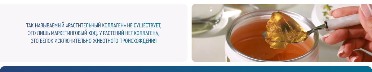 - ТАК НАЗЫВАЕМЫЙ «РАСТИТЕЛЬНЫЙ КОЛЛАГЕН» НЕ СУЩЕСТВУЕТ, ЭТО ЛИШЬ МАРКЕТИНГОВЫЙ ХОД. У РАСТЕНИЙ НЕТ КОЛЛАГЕНА, ЭТО БЕЛОК ИСКЛЮЧИТЕЛЬНО ЖИВОТНОГО ПРОИСХОЖДЕНИЯ.