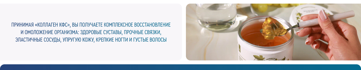 ПРИНИМАЯ «КОЛЛАГЕН КФС», ВЫ ПОЛУЧАЕТЕ КОМПЛЕКСНОЕ ВОССТАНОВЛЕНИЕ И ОМОЛОЖЕНИЕ ОРГАНИЗМА: ЗДОРОВЫЕ СУСТАВЫ, ПРОЧНЫЕ СВЯЗКИ, ЭЛАСТИЧНЫЕ СОСУДЫ, УПРУГУЮ КОЖУ, КРЕПКИЕ НОГТИ И ГУСТЫЕ ВОЛОСЫ.