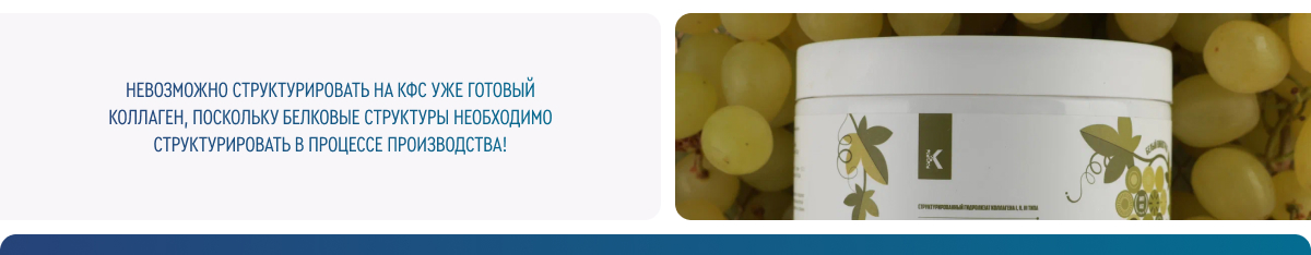 ВАЖНО! НЕВОЗМОЖНО СТРУКТУРИРОВАТЬ НА КФС УЖЕ ГОТОВЫЙ КОЛЛАГЕН, ПОСКОЛЬКУ, КАК БЫЛО СКАЗАНО ВЫШЕ, БЕЛКОВЫЕ СТРУКТУРЫ НЕОБХОДИМО СТРУКТУРИРОВАТЬ В ПРОЦЕССЕ ПРОИЗВОДСТВА.