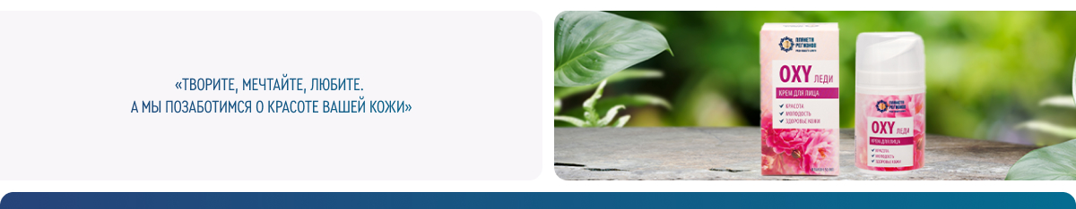 Для того, чтобы как можно больше женщин правильно ухаживали за собой, были красивыми и счастливыми в любом возрасте, Компания «ПЛАНЕТА РЕГИОНОВ» представляет крем для лица «OXYледи» и лосьон для ухода за областью вокруг глаз «OXYоко». Активным действующим веществом в косметических средствах является OXYхлорофиллКОСМЕТИЧЕСКИЕ СРЕДСТВА ЛИНИИ «OXYхлорофилл» – ЭТО КРАСОТА, СИЯНИЕ, ВДОХНОВЕНИЕ, ДВОЙНОЕ ВОСХИЩЕНИЕ ОКРУЖАЮЩИХ И ТАЙНА ВАШЕГО ПРЕВОСХОДСТВА! ПРИМЕНЯЯ СРЕДСТВА ПО УХОДУ ЗА КОЖЕЙ ОТ КОМПАНИИ «ПЛАНЕТА РЕГИОНОВ», ВЫ ВЫБИРАЕТЕ ЛУЧШЕЕ ИЗ ВОЗМОЖНОГО!